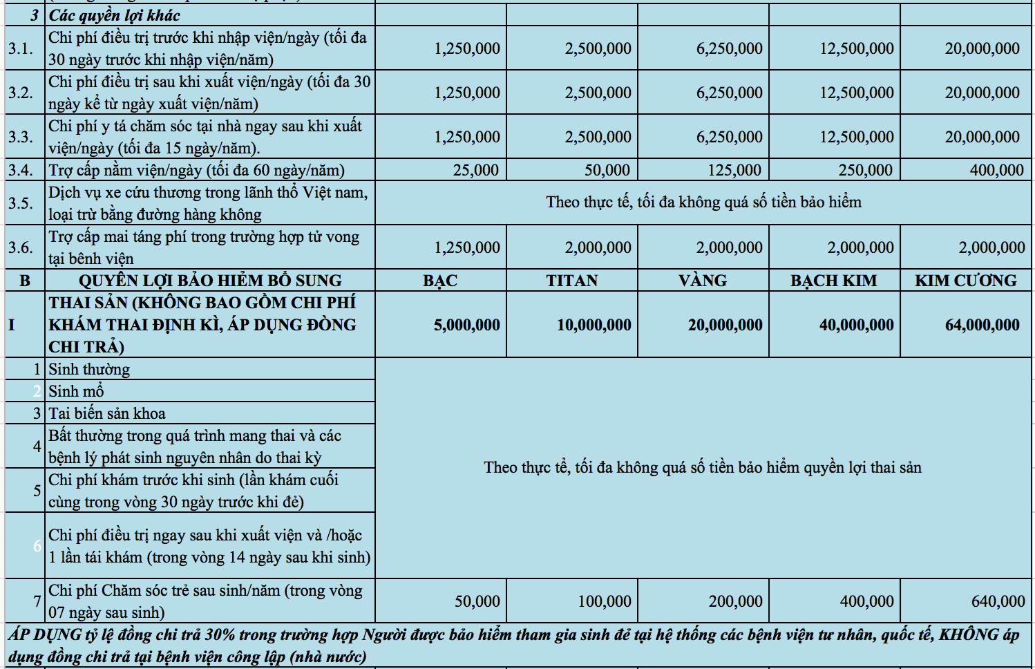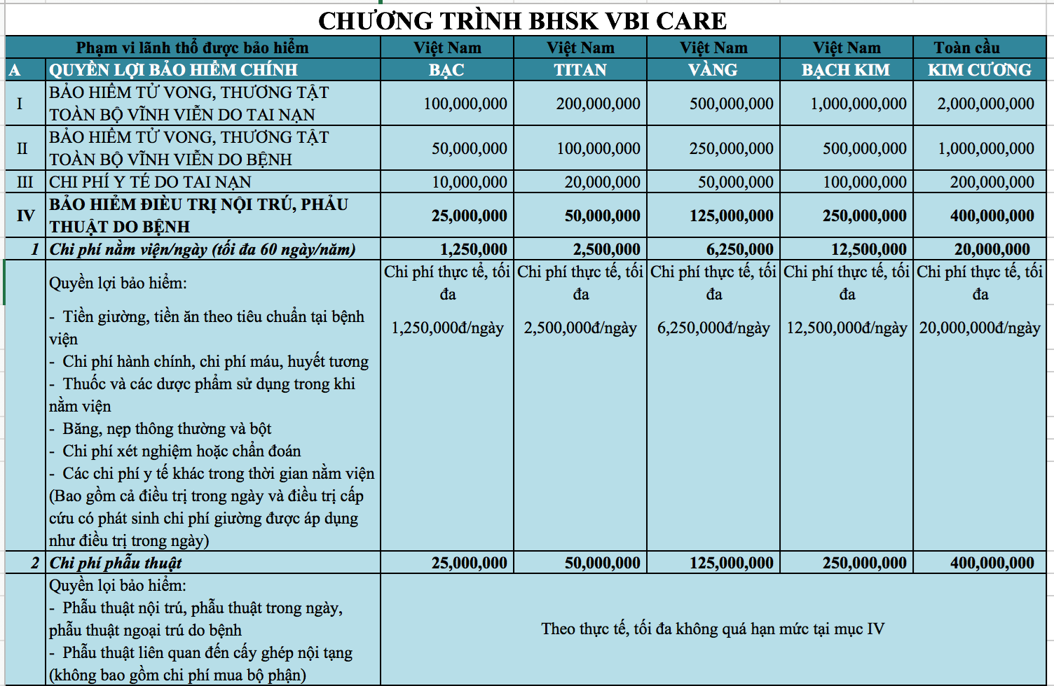BẢNG CHI TIẾT QUYỀN LỢI VÀ PHÍ BẢO HIỂM SỨC KHOẺ VBI CARE