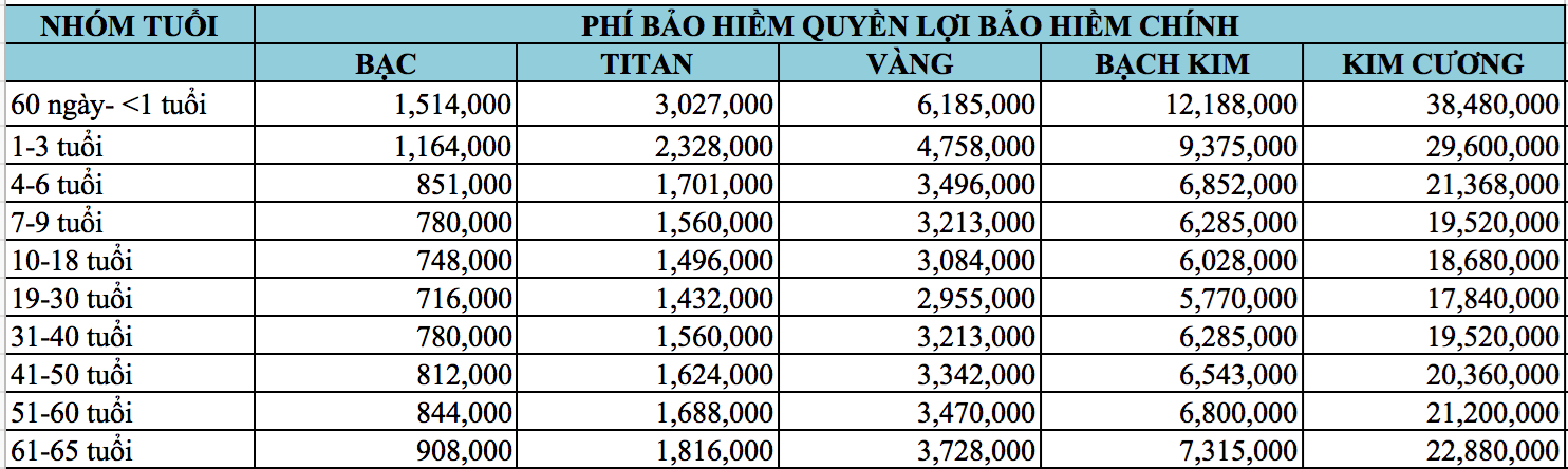 PHÍ BẢO HIỂM VBI CARE THEO TỪNG ĐỘ TUỔI